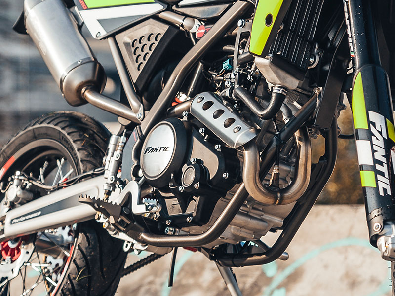 En termes d’équipements, cette Fantic est équipée d’une fourche avant inversée, de freins à disque avant et à l’arrière Wave combinés, ainsi que de pneu Motard de 17″.
