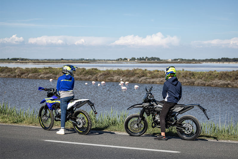 La Sherco 50 SM-R est la moto idéale pour les amateurs de virages et de dérapages sur l’asphalte. Avec ses larges jantes en alliage de 17 pouces et ses freins puissants à disque pour les deux-roues. Le nouveau cadre multitubulaire en acier garantit une excellente stabilité, tandis que son esthétique a été complètement mise à jour avec des nouveaux kits déco en particulier pour les coloris Blackmoon et Silver. On retrouve également un nouveau silencieux en aluminium proposant une sonorité unique. Au cœur de la moto, se trouve le moteur Minarelli à refroidissement liquide fiable et performant, associé à une boîte à six vitesses.