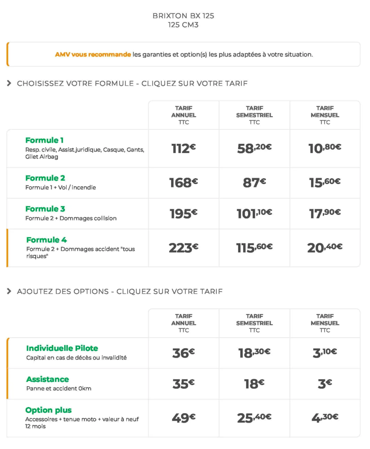Exemple de devis AMV, tarifs des offres pour une Brixton 125 cm3.