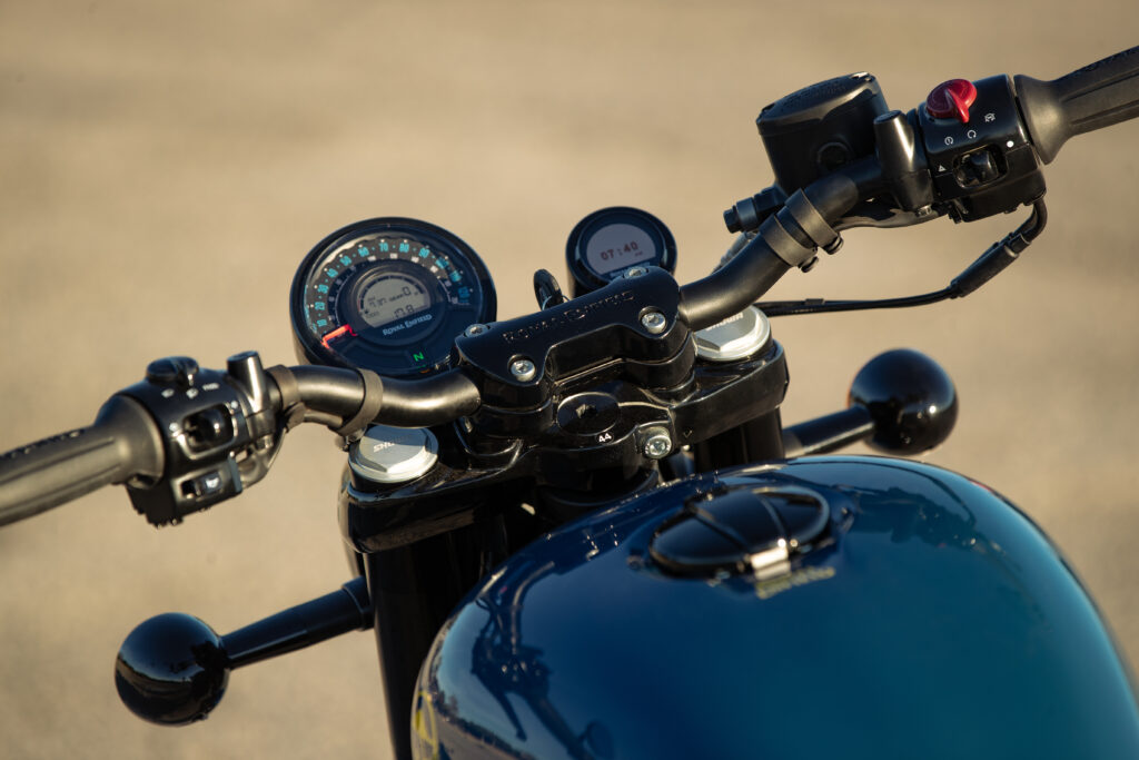 Le design de la Royal Enfield Shotgun 650 allie l’esthétique rétro-futuriste à des équipements modernes. Le phare à LED intégré à une nacelle custom reste fidèle à l’esthétique néo-rétro tout en améliorant la visibilité. Le bloc d’instruments numériques analogiques comprend le système de navigation « Tripper », fournissant toutes les informations nécessaires lors des escapades.