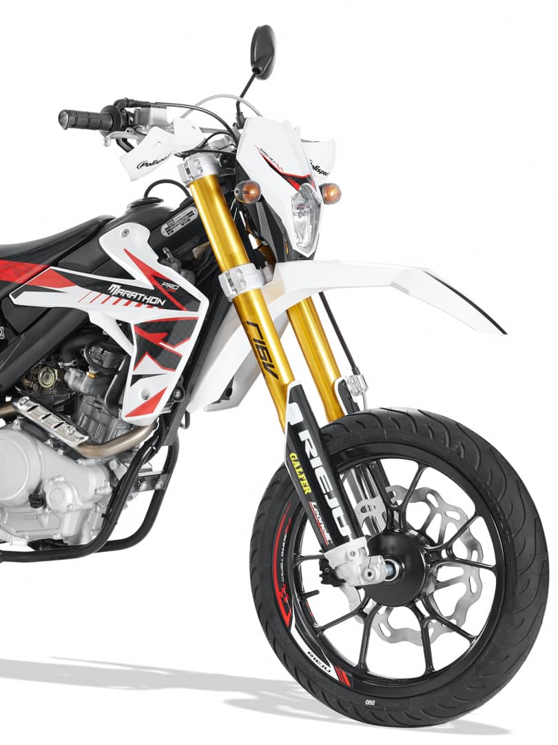 Le mono amortisseur doté de bouteille à gaz séparé, assure une suspension confortable pour une expérience de conduite plus agréable. La Rieju Marathon 125 SM Pro est la moto la plus attractive et efficace sur le marché pour les amateurs de supermotards.