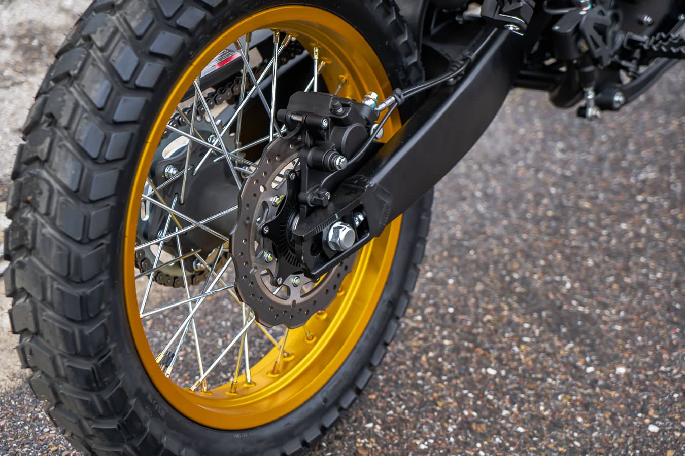 Son look est définitivement inspiré des trails des années 80. Ses jantes à rayon, ses pneus à crampons, son garde-boue haut et sa selle plate lui confèrent un look scrambler du plus bel effet.