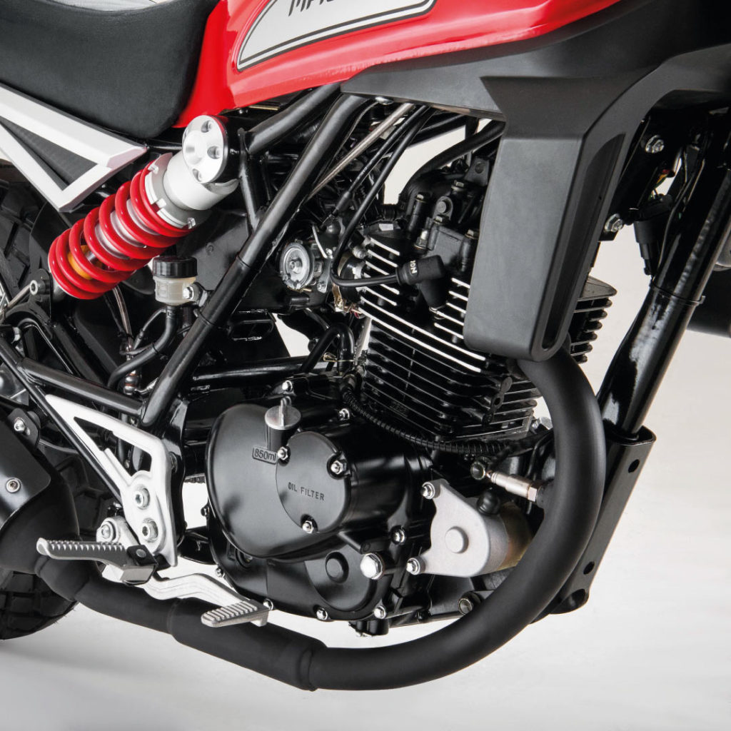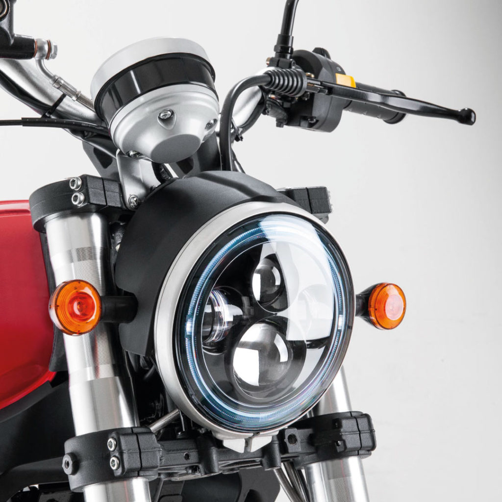 Voici la Mash Falcone 125 cm3 ! Un scrambler polyvalent avec un look néo-rétro unique, et des équipements de série performants. Son monocylindre 125 cm3 développe 11,6 chevaux et permet de propulser les 127 kg à plus de 100 km/h ! La Falcone est également bien équipée : elle possède des feux LED efficaces, un compteur digital, des suspensions arrières réglables ainsi que des jantes à rayon. Enfin, sa fourche hydraulique inversée et ses pneus avant de 17 pouces lui permettent d’être agile en toutes circonstances. De quoi se frayer un chemin hors des sentiers battus avec confort et style.